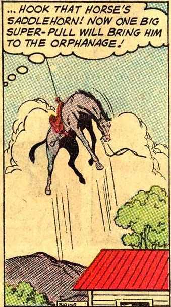 Supergirl fulfills the next dumb wish by hurling an unsuspecting horse through the air.