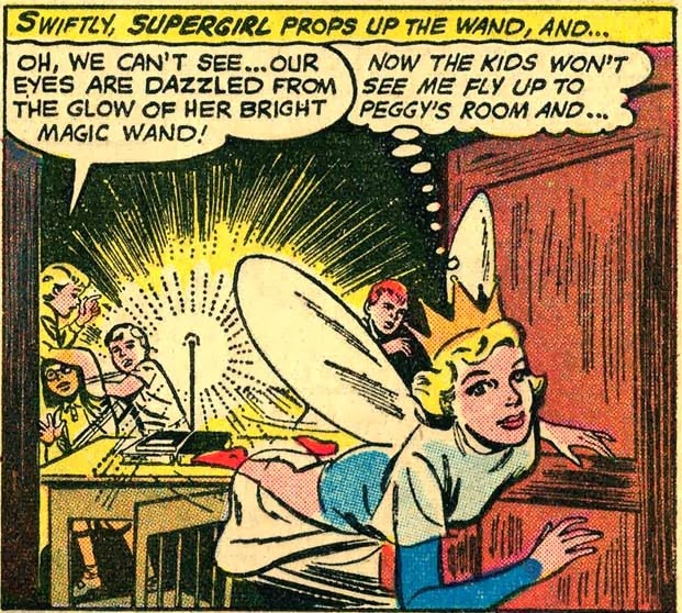 Tommy’s asks Supergirl to make the “plainest girl” Peggy look beautiful in the mirror, snickering because he considers this impossible. Instead of boosting Peggy’s self-esteem by telling her she’s fine as she is, Supergirl instead blinds everyone in the room and rushes upstairs to get a photo of Peggy’s pretty mother. She then hides the picture in her mirror and shows it to Peggy, convincing her she will one day be beautiful, somehow counting on her not recognizing the stolen photo.