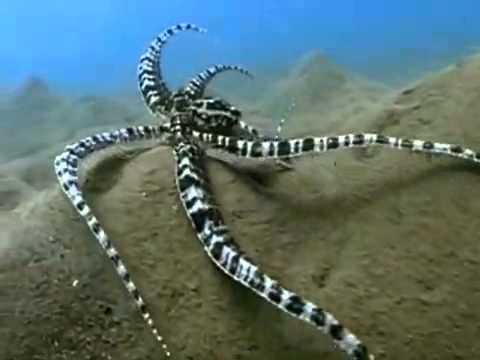 The octopus is relatively vulnerable to attack. To survive, it imitates animals that other creatures would not like to tangle with. To sneak along the seabed, it mimics a poisonous flounder and ripples against the sand.
