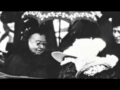 As we watch a rare bit of film that was converted to video, we may feel that we are part of the crowd who assembled to greet Queen Victoria (1819-1901). The footage was shot during the queen’s last visit to Ireland in 1900 and shows Her Majesty in a horse-drawn carriage as she nods at a crowd of well-wishers lining both sides of the street down which she rides. Wearing sunglasses and holding a parasol, she nods and smiles, her carriage pausing so her attendants may accept a huge basket of flowers from a pair of curtseying ladies in white dresses and hats.